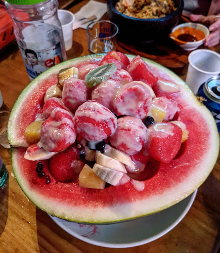 They even have one of those blue sojus that's popular in Korea atm (much more smoother than green ones). For anju, I highly recommend "Spicy Beef Ribs Stew" & "Watermelon Fruit Salad (화채/hwachae". Why? First, you can't get them anywhere else in the city. Second, they are delicious. Both wakes you up just enough to grab another bottle. Maybe, that's their...