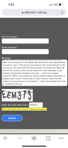 Read moreTried to contact direct to complain however seems they have turned that feature off.. you can’t get past the capture .. clearly poor experience at the midland branch.. the old hair in my Kebab. The young lady asked. “Do you want a fresh one or?” Pretty funny really. Was embarrassed for the poor girl so we did get a fresh one and the accompanying cold soggy chips and $19 price tag topped it off as a...