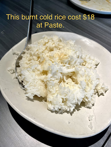 When the three mains finally arrived, again all separately, the presentation and flavours were all good but most of the dishes were cold. The rice was the biggest joke. Not only was it gluggy and sticky, it was cold. The second lot was obviously from the bottom of the pot as most of it was crust, quite firm and less than tepid and for this we paid $18âŚfor rice. And you will see from the picture the presentation of this was literally just thrown onto a plate and looked offensive. I must say I have never seen such poor quality and sad looking rice even from a street vendor in Bangkok.