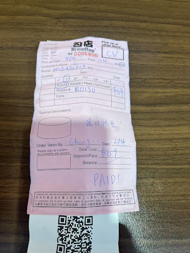 Read moreOn April 2nd, my dad ordered a durian cake from Bread Top at MOLI, specifically requesting the durian flavor. He was told the cake would be ready for pick-up by 4:00 PM on April 5th, and he paid in full on the same day. However, when he arrived at the store around 3:00 PM on April 5th, he was told that the cake was not yet ready and that it would be made on the spot. He was asked to wait outside for 40 minutes.