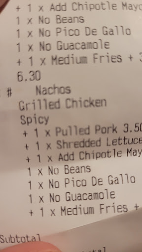 Read moreFood is normally fairly good and service is usually lovely. However, tonight I ordered a meal online and went immediately to the window as I wanted to request a change which wasnât available on the app before the staff started cooking. This was simply that I wanted to filling on my nacho fries. I approached the window and told the lady on the speaker what my order was. I then attempted to ask if I could remove all meat from the meal and was continually interrupted with her saying âwe only got that like five seconds ago and havenât startedâ. Once I was finally able to get a word in I requested to remove the meat to which she answered âright no filling, but like I said we only just got that orderâ. I drove around to the window. At the window I waited a couple of minutes which I expected. Then my food was thrusted at me by a female worker without a smile or a word other than âorder 2066?â. This was at 8:30 on Sunday evening 4/8. Not sure whether she was having a bad day but definitely needs an attitude adjustment and a chat...