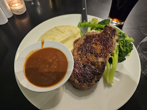 Food came out reasonably quick given how busy it was. Order a 250g porterhouse rare, with mash and seasonsed greensand dianne on the side, and the garlic prawns as a main for my partner. The steak was cooked perfectly, however the seasoned greens were drowned in pepper. The garlic prawns only had 10 small prawns for a main size, with sadly any garlic in the sauce.