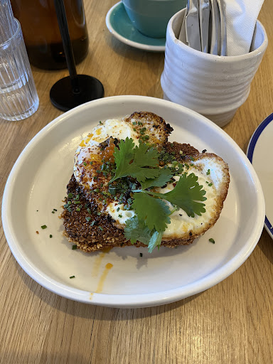 Food tasted delicious. We ordered scrambled egg with pecorino cheese and chilli shrimp toast. Perfection! Great way to start the day.