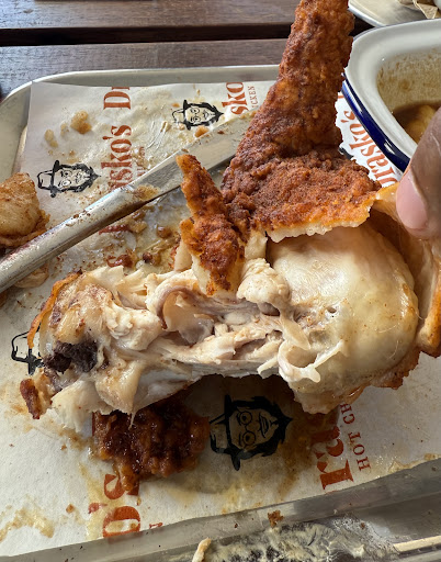 Read moreYou’d have to have been living under a rock not to have heard of Draskos in Mount Hawthorn! It is one of the few places in Perth that you’ll always find a queue, which is why, although it is local to me, I had not yet tried it. So I was excited last night at 5.30 when I walked past on my way to get dinner somewhere else and noticed nobody in there. I quickly took my opportunity to find out why this place is usually packed with customers. I was greeted by the friendliest counter staff I’ve come across in a long time. We had a great banter while my parents and I chose from the menu. He helped me choose the right heat for a first timer (no one wants to end up on the toilet for 5 hours passing the spawn of Satan🥵) I chose the signature Sando meal. We then sat down and waited for our meal. We waited a while and I watched people come and go, picking up their orders. It was at that time I noticed the picture on the wall which looked just like our humble server. Turns out that’s Drasko!! Wow!! It was lovely to realise that the friendly server was actually the owner!! This is what you look for in a restaurant! Passion in customer service that is often missing in other restaurants. I decided then, that I’d probably come back here even if the food was shite, just for the banter. The food came, and it was most definitely not shite!! The serving size was large which was good considering the price and the taste was Amazing! I ate it all even though I was full half way through. I shall definitely be coming back to Draskos to try a heat level up. I might even queue up for it....