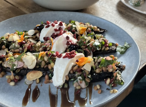 Delicious combinations of flavours and textures, - beautifully balanced elements in every dish, combining tender, succulent chicken or lamb with pomegranate, figs, almonds. Excellent vegetarian options too, with delicious hummus, falafels, cheeses, and salads.