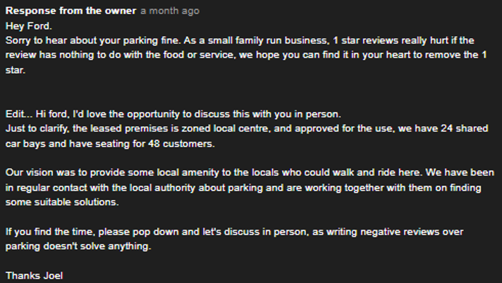 Inadequate parking provided so it was very expensive when you add the price of the parking fine. Regarding your response. Your cafe has about 14 parking spaces, given you share the available parking with two other buildings. Your cafe has seating for around 70 people. Itโs clear to see that you were never going to have adequate parking for your staff and patrons so the issue with parking in the area is very much the result of your inadequate planning. Approval for a cafe seating only 20 people was previously denied for this location due to the lack of parking. I have no idea how your cafe was approved.