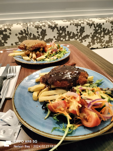 A year later and another review this occasion dined up stairs to n the Brasserie. Well lit and warm, sunny seating for a winters day. Snitty was moist, though the crumb wasn't my fav, the prawn skewer topper was disappointing, very commercial, prawns welded on to skewer and the Hollandaise didn't really sing with this. The side salad was the best, freshest edible side salad I've ever received, anywhere!!!, The Salt and Pepper squid looked oily and the same crumb as the Snitty. I think this crumb is too oil absorbent. The chips weren't crispy and had no seasoning. The Onion rings in blue cheese sauce was squirted out of possibly a home brand container, no blue cheese flavour at all. Seemed more like a whole egg mayo.