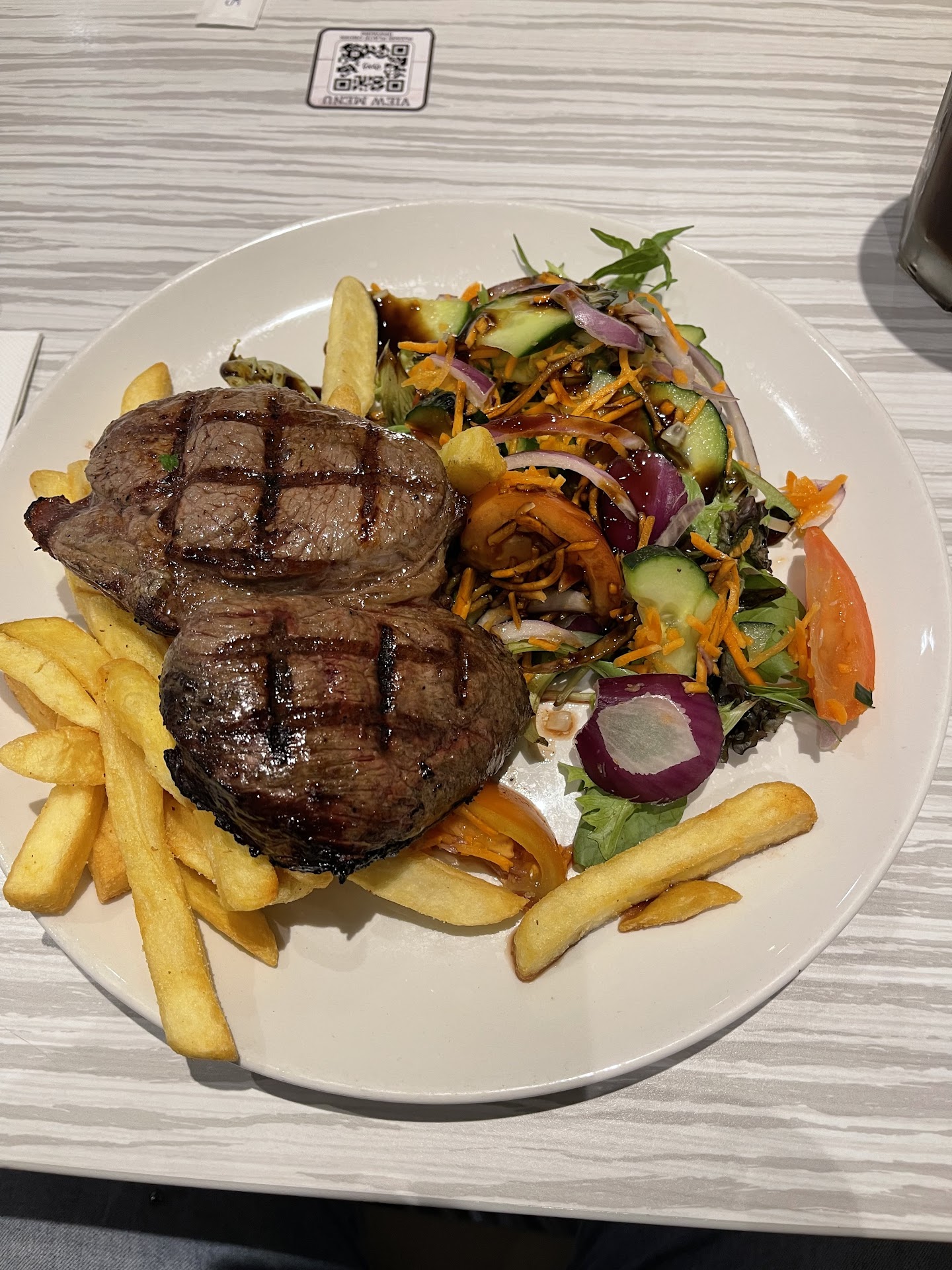 I asked for my steak to be medium, and it came out medium. It was perfect. The salad was salad, but it was good with steak and chips.