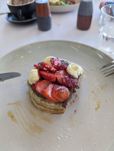 While my mother-in-law was quite pleased to see her usual, barramundi and chips ($25), our disappointment was somewhat assuaged by being allowed to order a dozen deep-cup Pacific oysters ($40/12) from the night-time menu. We took them three ways—au natural, sloshing in over-done ponzu and chives, and under a clever cheesy bacon and wasabi topper. Oysters felt appropriate in this coastal venue filled with whitewashed furniture, fishing basket lights and—being a corner restaurant—plenty of natural light. Beef cheeks ($25) with crisp Brussels sprouts and confit spuds seemed a bit heavy for a seaside lunch, but are well and were generously proportioned. Many guests seemed to be soaking up the restaurant’s laid-back vibe and lingering over all-day breakfast. Not feeling like a dish with bistro-style fries, I opt to join them by switching out smoked salmon for copious bacon on the smoked salmon crumpets ($20) with scrambled eggs, spinach and caviar.