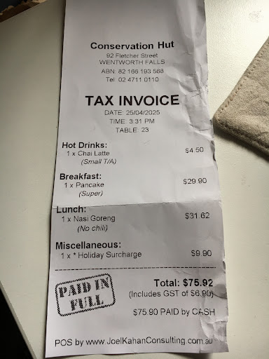 Read moreCheck your receipts! To start positively, it is a nice view if you can get one of the outside tables. Inside is well lit and ventilated, but is more densely packed and acoustically louder. Service was friendly and the food came out within a reasonable time even during a busy time. Food was ok. The "nasi goreng" was a bit on the smaller side and the fried enoki, while a unique substitute for fried shallots did not have the crunch I would expect. The "deep pan" pancake was an interestingly unique texture and flavour, but going "super" I think ruined it for me with a tonne of sugar. I think it's the same pancake for both options, the "macadamia pancake" is just the plain one with chopped macadamia sprinkled on top. Unfortunately what brought it all down was the bill. Now just to make sure the math is correct, it was a public holiday (and they had clear signage a 15% surcharge was in place) and I paid cash so the card surcharge was not applicable. I attached the receipt for reference. I doubt that the menu price of the fried rice was $31.62 so some form of surcharge was already being applied. From memory the pancake should have been closer to $26 but it was billed as $29.9. That would have been fair, if not for an additional $9.90 Holiday surcharge on top of everything. If my math is right, with 15% on top of 15% the final surcharge is...