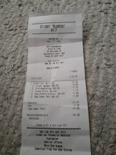 Read moreConsistently dirty eating area. I have known this KFC for many years and it has improved little in cleanliness or service efficiency despite having had some cosmetic facelifts over time. When I visited with my family recently it was difficult to find a seating area that was sufficiently clean to seat ourselves. Eventually chose the least dirty seating area. The floor had an unpleasant slippery greasy coating that covered most of the floor area. The meal was lukewarm, the chips were oversalted (as usual) and quite limp. Each time I (occasionally) visit this KFC it reminds again why I shouldn't waste my money there. There appears to be very little concern about customer satisfaction. While you can hardly expect fine dining at a fast food business such as this, the reality is that Macca's (McDonalds) next door and Red Rooster just up the road, do a much better job with food quality and...