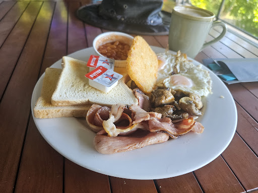 I got breakfast the following morning- a true blue Aussie big breakfast, with 2 pieces of white toast among a substantial helping of bacon. The standard pair of fried eggs, ramekin of baked beans and a hash brown completed the set - I ordered mushrooms with it, a tasty addition. The flat white was fine, a decent country quality brew.