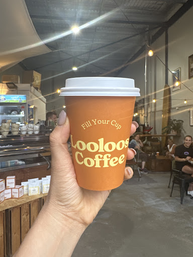 Loo Loos coffee warehouse in Kincumber is located in an industrial area with the roller door open to see the cafe and retail section.
