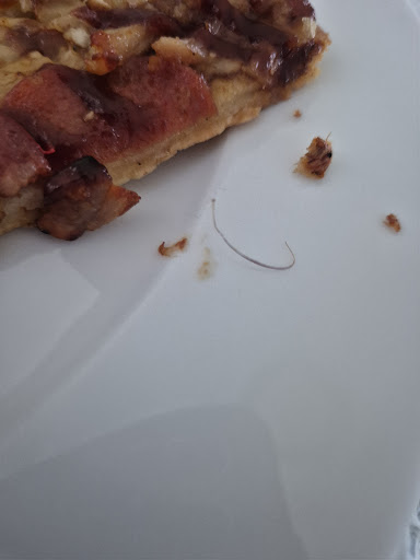 Read moreOrdered from here last night, online ordering was easy. When I arrived it seemed like no one cared, there was about 6 guys all not in uniform, not wearing hats and some only wearing thongs just sitting on chairs not far from the counter, no one was there to greet me. They were all speaking in a different language to each other. The spud bites were soggy, and there was pieces of hair in my pizza (see photo attached). No one wears hairnets or hats and no uniform, no wonder pizzahut is going down. the culture of the people running it don't care. There's no way of contacting them easily so didn't bother...