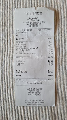 Read moreHave been going to Porters for a few years now. I order roughly the same item. 1 poached egg with mushrooms or hashbrown or spinach or the beetroot relish. Today I went with friends and I am embarrassed to say the least. Firstly I ordered a coffee which took nearly 20 minutes and they were not busy at this stage Then I ordered 1 poached egg mushrooms and 1 hashbrown. My meal came out with 2 poached eggs and 2 pieces or cheap nasty bread that I did not order and the mushrooms. I gave the girl the egg and bread I did not order and then realised I had not received the hashbrown. When I was able to get someone's attention I let them know I had not received the hashbrown. When paying I was charged $31.35 for my 1 poached egg, mushrooms and a hashbrown with my small strong flatwhite on almond milk. Will not be returning. Appalling prices for what we got. Certainly not worth a revisit. You can tell there is...
