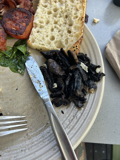 Read moreMyself and my partner went in this morning to have breakfast as it’s been awhile going there. It’s our favourite cafe when sit and chat closed down. We did the self serve at the table. Everything was great till we got our food. At first I wanted to give it back and say something but i was really hungry and we just had to put more salt and pepper then usual. In the photos you can see the mushrooms are very burnt, bacon is very over cooked and very hard my partner has false teeth so he wasn’t able to eat all of that as it will hurt his gums. My partner also order a cappuccino and it was burnt. It’s very upsetting that our local cafe couldn’t deliver like they usually do. It blows my mind that they think that was a good idea to bring out to the customer to begin with. I understand most people like to eat burnt mushrooms and over cooked bacon but not everyone is like that and if that’s what I wanted I would have made a note of that in my order. I don’t think we will be back there again. Other than the food everything was great. The atmosphere is good and the staff are very welcoming and helpful. I just think you might need to chat...