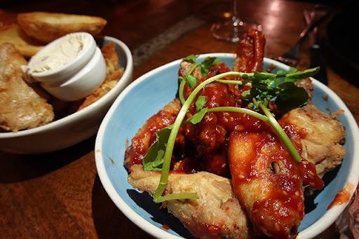 Craving something fast in the cold weather, we order Potato Skins ($14), which come with a too-cold pot of caramelised onion cream. Theyâre too thick to really be called skins, and under-seasoned, making them a bit boring to eat, particularly with such a paltry amount of onion cream. Thereâs more flavour in our Crispy Chicken Wings ($18/half kilo, $24/kilo), half-smothered in sticky hot Korean sauce (gochujang) that has nice, lip-tingling heat. We accompany these share-plates with a 2017 Heslop Chardonnay ($45/bottle) from the neighbouring wine region of Mudgee. Itâs served quite cold, but improves as it warms, throwing fresh melon with the tiniest suggestion of oak.