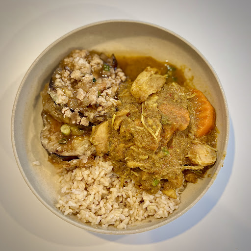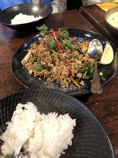 We had the eggplant and chilli stir fried with beef, chicken larb, twice-fried pork belly and green curry with chicken. The token vegetable dish, eggplant, turned out to be the best surprise of the meal. Soft, silky and imbued with sauce, it paired beautifully with the tender slices of beef. The rice was the perfect blank canvas that brought out the deliciously smokey flavours of the eggplant. We fished out all the eggplant first, agreeing it didn’t really need the beef.