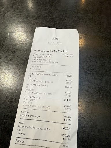 Just visiting Newcastle for work and I happened to walk past this restaurant while thinking of what to get for dinner. A young family were eating outside and their food looked so good I stopped and ordered pad see ew take-away for dinner tonight. Iām eating it as I write this review, and it is so yum! Itās one of my favourite dishes that I always get and they are usually delicious no matter where I buy it from. This one however has so much flavour and it has such a great ratio of meat, noodle and veg (I got beef). Will definitely order it again when I come back to Newy. The only thing I would change would be to add a slice of lemon that I could squeeze over it but that would only add to it. Not having it doesnāt take anything away from the food. Much...