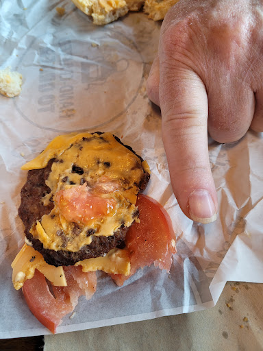 Read moreLet's just say our visit was a first and definitely a last. We sat at a table that had been wiped down but was not clean. The napkin dispensers were filthy. I took photos of the one at our table, which was empty, as well as the table next to us. As you can see, it's unhygienic! Basic cleanliness, people! The onion rings were basically inedible. The majority were the outer layer of the onion that we all throw away! It's hard, chewy, and impossible to swallow. The other rings were coated with so much batter that I couldn't find them! Disgusting... The actual burger - if you could call it that - was disgusting. As you can see in the photo with the finger next to the (and I say this with tongue in cheek) burger, it's minute, small, tiny, little, kids sized but with the price of an adult burger. Who are they kidding? I'll never complain about Maccas downsizing again. This place brings it to a new level. The ANGUS patty was so burnt it could have been the neighbours cat. I'm serious here. No taste, and if I'd banged it on my dirty table, the table would have come off second best! I could go on, but look closely at the photos, and you'll see why I am suffering eye tics and drooling from nerves several weeks after my visit there! 🥴 Highly discourage anyone with any tastebuds to go there 🥺😂