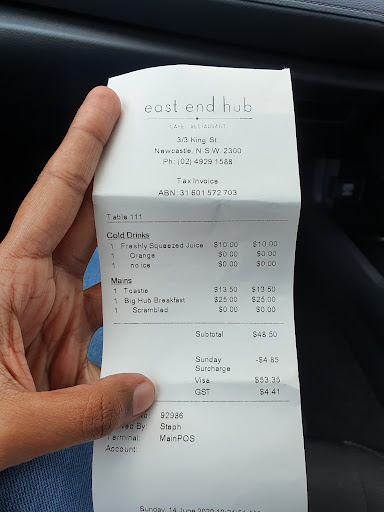 Chose East End Hub to meet a friend for brunch. It’s Sunday and I expected it would be busy, so was happy to wait to be seated. I chose an outdoor table with partial shade. Someone had spilt a coffee on the floor right near our seats; I asked for some paper towel to soak up the spillage. No assistance was offered and no paper towel/napkins were provided. The staff just stepped over and around the spillage next to us. Coffee was ordered and served without a problem. The waitress returned to take our food order. My friend ordered the Big Breakfast and asked for spinach in lieu of the chorizo. She was informed that there would be an additional charge for the spinach. She decided to forego both chorizo and spinach. I ordered the poached eggs with chilli jam on the side. I requested my eggs be poached to medium, only to be informed that the kitchen doesn’t cook eggs to medium; choice is limited to soft poached or hard poached eggs. However, the waitress went back to the kitchen to confirm. Another waitress came out to confirm that the chef aims to poach eggs to medium and that she would check back with me once served. When asked if the other waitress had put our order through, we said we thought she had. We waited and waited for our meals, watching patrons who arrived after us being served. After 30 minutes or more, I finally caught the attention of the first waitress and asked about our order. “Oh, it will just be a few more minutes.” The eggs were definitely not cooked to medium, served with runny undercooked egg white. The bacon and hash brown served with the big breakfast were overcooked. All-in-all an experience I have no desire to repeat. The view is the best thing this restaurant has...