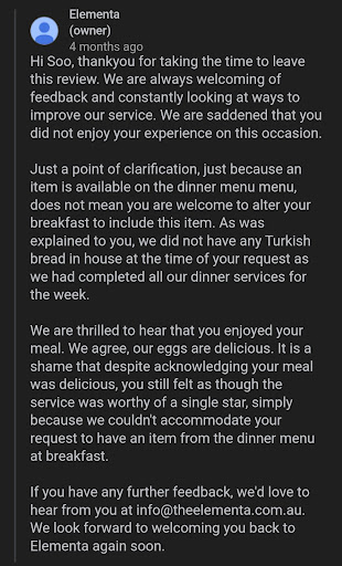 Read moreInteresting dining experience with some outstanding moments but some suprising 'elementas' of disappointment too. Friday lunch @ 1pm. The restaurant was not busy with just a few tables occupied. We sat outside on the patio. The view & atmosphere was lovely. We selected 3 small plates, a main share & the green beans as the vegetable share. The menu selection is not extensive but, certainly, looked great (eg: Just 3 Vegetable Sides on the menu with a choice of carrots, beans or salad but each of the 3 choices sounded interesting as described on the menu). We were looking forward to tasting what we'd selected having read how impressive the Elementa fine dining experience is. At the point of ordering our lunch & wine we soon were informed that our vegetable share plate selection was unavailable (1 of the 3 choices in that menu category unavailable). We chose a glass of Merlot to accompany our meal & were, again, informed that Elementa was out of that too. The wait staff member suggested another wine as an alternative (which we appreciated). As the suggestion was not listed as 'sold by the glass' and there is a range of finer wines on the Elementa winelist , my husband asked of the cost of the suggested glass of wine. The response was, "Cheaper than the wine you chose" and that was it. Not a fine dining or helpful response by any standards... unusual service. But, when the suggested wine arrived it was perfect for our chosen Beef Short Ribs so we concerned ourselves with the positive. On the most part, our lunch was very tasty, particularly the kingfish sashimi, the kangaroo & short ribs. The fried mushrooms were dry & a disappointment but we did love the rest, including the carrots which we had in lieu of the unavailable beans. The Elementa course portions are small but of excellent quality. Ordering 3 small share plates, one main plate & a vegetable share was perfect lunch. To accompany our lunch, we enjoyed 4 drinks (1 beer & 3 glasses of wine) between the two of us. At 2.20pm, we decided we'd finish lunch with coffee. Our request was met with the now familiar response of, "unavailable". Unbelievably, coffee, like the wine & vegetable choice, was not possible at Elementa for our lunch experience. We paid our account ($220) and headed to the nearby Newcastle Cruising Yacht Club to finish lunch...