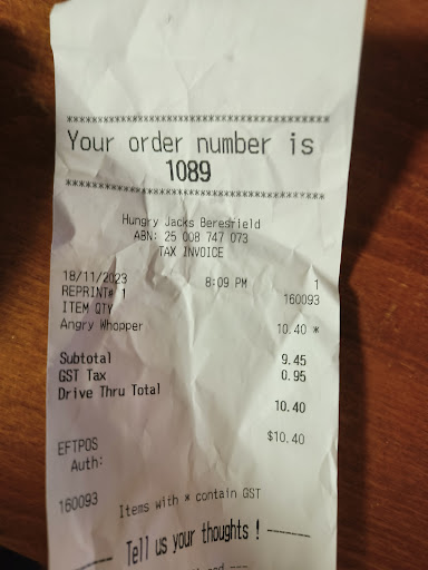 Read moreBERESFORD was ok. The burger was good, but I had to ask for salad like on the picture. I did not want extra just what is advertised. But I think I was charged extra for what should have been standard this is a shameful fraud. Shortages of lettuce and tomato excuse does not cut it. Take down the pictures if you cannot supply the product. People should get it without asking or paying extra for what is displayed on the advertising. After years of loyalty to Hungry Jacks burgers. I found when I came back from asia after 7 years, hanging out for HJ burger. They have these great offers and big colour pictures of burgers with packed filling lettuce, onion, big red slices of tomato cheese etc. When I got my burger at Gosford west it was flat dull and lifeless. A slop burger slapped together a few bits of lettuce a couple of green slices of tomato. So I complained. The child, girl who was supposed to be manager argued with me and spoke over the top of me when I complained I said its fraud to show advertising and then not give what customer pays for. She was too young, rude and no idea how a manager handles a customers complaint. This caused me to get upset and customers to get upset at me for complaining. This Is wrong, Hungry Jacks should stand by their product and what is advertised. If they cannot supply in the burger what is in the pictures they should have signs saying so. Besides lettuce and tomato prices have gone down now. You should not be asked to pay extra for what is pictured as supplied. This is deception and rorting. SHAME ON YOU HJ. I HAVE TO GO ELSEWHERE, I HATE...