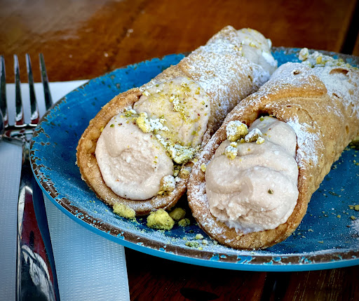 Dessert = Ricotta and Choco Dip Cannoli with pistachio. To die for. 2 large beautifully crisp cannoli, the filling was divine. I was only able to eat one so I have a spare for tomorrow 💪🏼