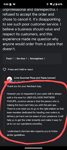 I encourage everybody not only customers of Lime but all small businesses contact the business directly and speak to the manager/ owner and inform them of your feedback so that continuous improvements can be made, rather then giving negative star ratings or reviews online or social media.