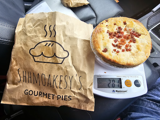 Shhmoakesy’s Gourmet Pies are now available from here so I dropped in to try a couple. This review is mostly about the pies but the staff were also very nice. Pie review follows. I had a trip back to Newy today so I thought I would go a little out of my way to finally try a Shhmoakesy’s pie. I arrived at the Sherwood Café at 10.30 and the pie oven was empty. Boo. They said they would have some hot in about 10 minutes so I dropped back a little later to a full oven. Yay. I chose a cheese & bacon pie and a Jalapeno and cheese. They were too hot to eat straight away so I drove half an hour towards my next job and pulled up at Fern Bay. For some waterside pie eating. The cheese and bacon was a good size at 281g. It had a good solid base despite the foil tray and was well constructed. The filling was really, really salty. Way too salty. I was very disappointed given their reputation. You could say I was salty. It is unfortunate because the flavour was almost really good and there was lots of great meat pieces, bacon and cheese. Overall, I would rate this pie a 6/10. Next up, the Jalapeno and cheese. This pie was a little smaller but still a good size at 249g. Once it was out of the foil, the base was a little soft and threatened to split open on the bottom but did hold together in the end. The flavour of this pie was superb and I had finished it off before I had a chance to get a photo of the inside. It had enough jalapenos and cheese and the meat was delicious. A solid 8/10...