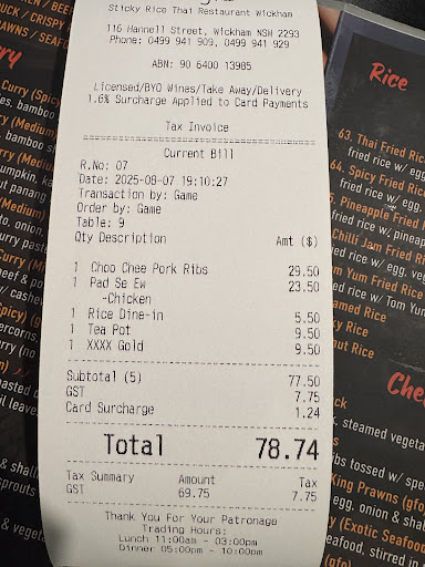 I recently dined at Sticky Rice in Wickham and was left very disappointed with both the food quality and customer service. I ordered the tempura prawns, the duck chicken curry, and the tom yum fried rice with chicken and extra vegetables.