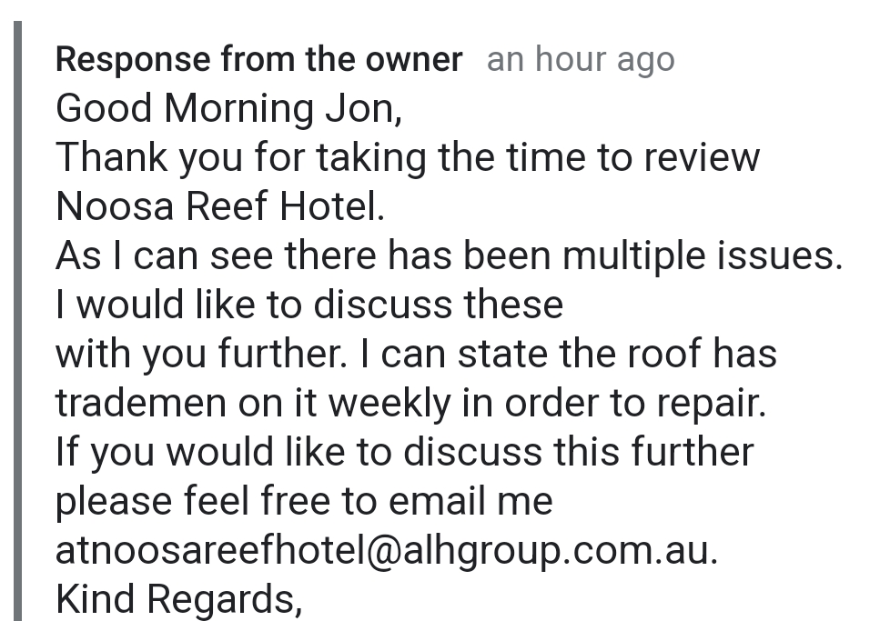 Response to reply from owner: Yes Jarrod, I'm sure there are tradesmen working on it every week, but I can see from the water marks it's been going on for months. The ceiling is a health hazard, the mould needs to be removed as well as any plaster that can potentially fall in on someone's head. This hasn't been done, but I'm not surprised to learn ALH owns it. What a shame.