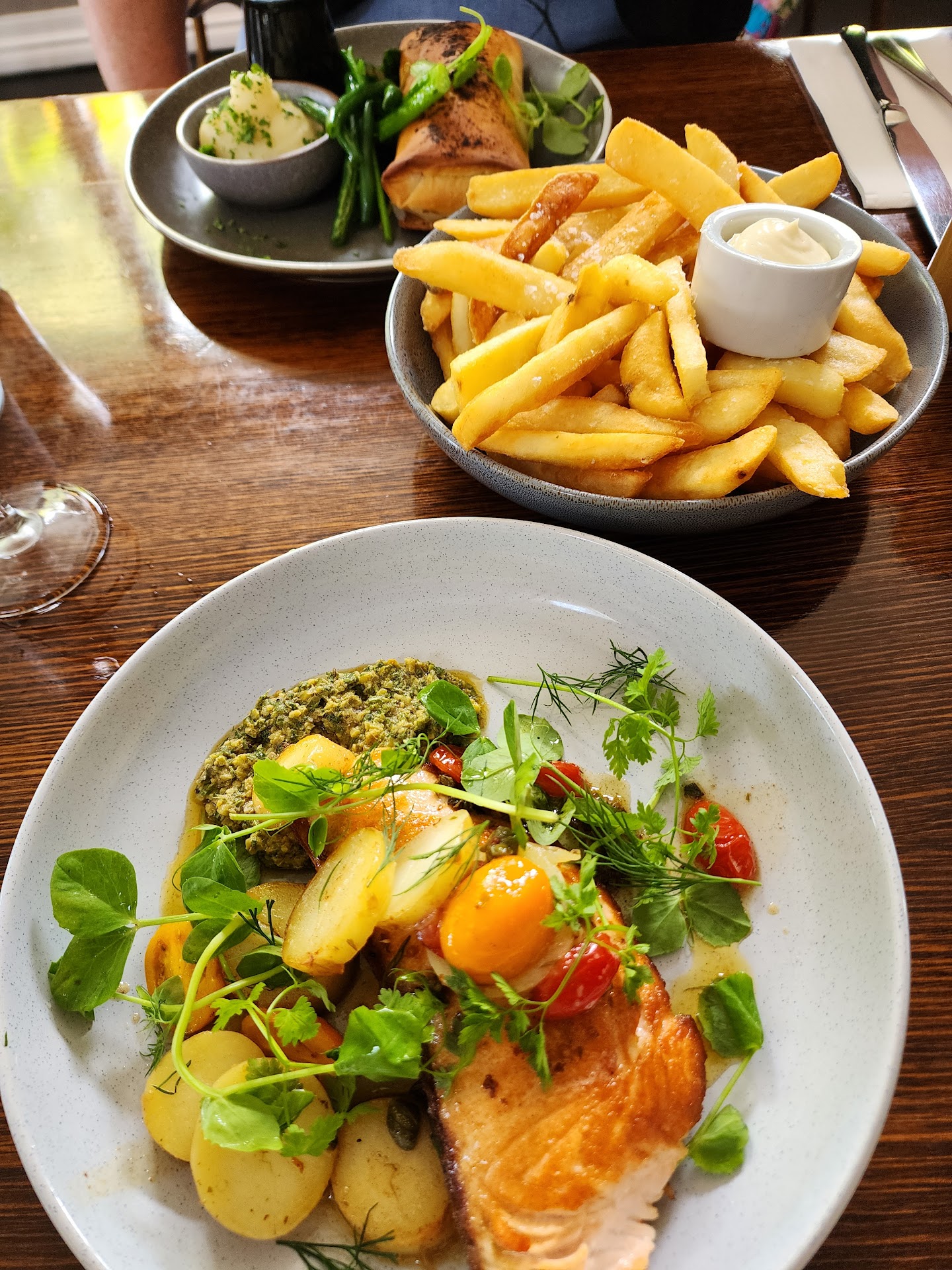 Nice atmosphere. Not too fussy and not too casual. Cool and breezy with big doors, open windows and high ceilings. Staff were really excellent, could not be faulted. Obviously well trained but they also seem to take pride in offering great service. Service was quick although we had the 5:30pm sitting so lots of staff without many guests. Might be different later in the night. Nice menu with lots of options that I would have been happy to select. Not so much seafood, which I thought was a little unusual for Noosa but that was fine with us as we had fresh seafood the previous day. Entres and main were good size and we didnt have room for dessert afterwards. Drinks list was considerably shorter than many other restaurants and there might be quite a few items that are unfamiliar but there were 3-4 choices in the range for each French varietal. We were able to find something enjoyable (a beer and 3 glasses of wine).We had baked Camembert (honey and plenty of toasted sourdough) and pumpkin arancini balls. Both nice. For mains seafood pasta and (the special) salmon crusted with sesame seeds. The pasta was a large serve with lots of fresh seafood. Little oil or sauce so quite fresh letting the natural seafood flavours shine, although it was quite chilli hot so you need to be happy with that. The salmon was a little disappointing. It was described as being still soft/jelly in the middle although that wasnât the case. I believe that it was baked and in my experience that saps some of the flavour when its cooked right through. I much prefer it to be crisp with caramelised flavours on the outside with the middle mostly jelly like which gives a combination of different flavours. overall overall it was a lovely dinner and we will definitely go back....