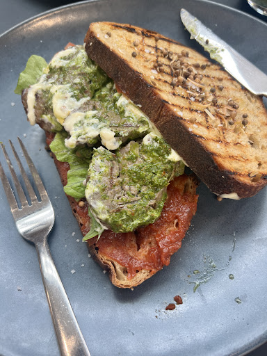 Steak sandwich presented on its own. Looked lonely on the plate. Not even complemented with at least some token salad garnish. Bread soggy, dukkah served no purpose really and fell off the bread when eating. Steak flavours overpowered by the dukkah.
