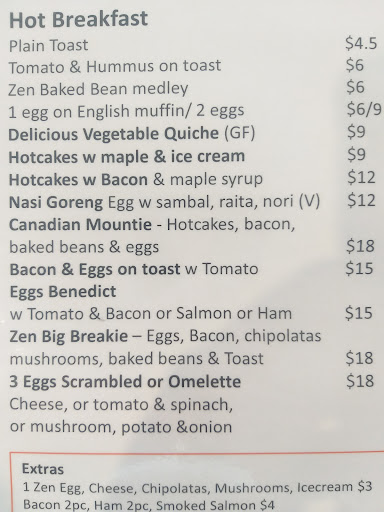 Read moreThe Cafe has set menus, priced at $18. They seem unable to change from what is advertised, asked for the Zen Big Breakfast with scrambled eggs told I can't do this as comes with poached eggs but if I want scrambled eggs with bacon and sausage (which comes with the Zen big breakfast) I have to order the $18 scrambled eggs and add the additional extra, it seems rather strange that in order to get the breakfast I want have to pay almost double just for...