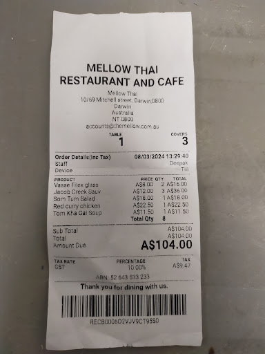 Read moreI have been a Darwin resident for 30 years and won't use Mellow Thai restaurant and Cafe again. I don't consider myself a whinger and am very accepting of most things but I received terrible customer service. I made a takeaway order by phone and when I went to pick it up the order I had made was not correct. I was challenged be the young girl behind the counter saying I had made an error. When I simply stated that that wasn't what I had ordered she got very defensive, accusing me of getting it wrong and after a 5 minute stand-off I walked out. There was no offer of a menu for confirmation she was on the attack from the get-go. As I said I'm not a whinger but I really wasn't impressed from the...