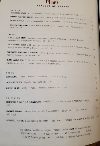 Read moreDuring the stay at Cooinda resort we ate many times at Mimi Restaurants. I never expected such great and creative food in a resort in the middle of Kakadu Nationalpark. The menu is divided into bar food with classics like burger and pizza and a main dishes. The bar food pizza was good with a broad variety of beer but my highlight was the main dishes. The steak was perfectly grilled with harissa fried aubergine and papaya salad. Also the self made gnocchi twisted with guacamole was an surprise. There was really someone in the kitchen who knows how to cook in a modern way. The service was work-and-travel run but all time professional...