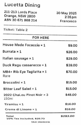 On Friday 30May25, my wife and I had a wonderful lunch at Lucetta restaurant in Orange. The menu offered a wide selection of high-quality ingredients, all prepared to perfection by a skilled chef. The restaurant served modern, authentic Italian cuisine, and all dishes were cooked to order. While this may have slightly extended the wait for some dishes, it was well worth the wait.