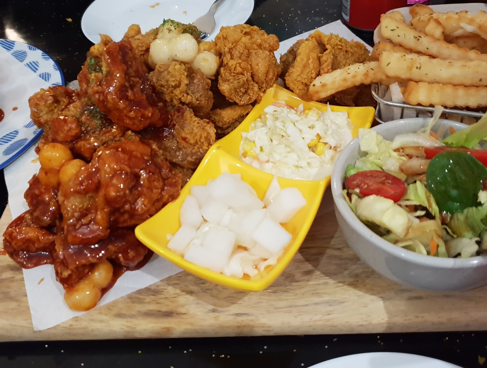 Things to note: You will be charged for takeaway containers. Other reviews/signage in the restaurant does say this, so I'm not bothered in the slightest but keep that in mind. The price was 50cents for a paper box and $1 for plastic container. I normally prefer bone-in chicken but the boneless chicken here is so generous in portion I recommend ordering boneless! The kimchi pancake is slightly crispy and slightly soggy. Goes well with the vinegary sauce but a bit bland on its own. I wasn't a fan of the capsicum in the pancake but it was something different. Another review said the chicken here was similar to Nene. Personally I'd disagree with this claim as the Snow Honey Butter chicken comes lightly tossed in a thick sauce with a creamy/cheesy flavour and not a dry cheese powder. It's different, but delicious! Reminds me of Carbonara haha I wanted some pasta to go with the chicken lmao The Garlic Chicken had a double chilli symbol on the menu which I believe would suggest it would be quite spicy. Personally, we did not find this to be the case as there was no chilli whatsoever (not complaining, simply advising). Perhaps people of a certain persuasion could find the pungent flavour of spring onion and dollops of minced garlic as 'spicy' or overwhelming, but we did not have any issue with the spice level of this. I'd recommend coming early to skip the crowd. Arrived around 5.30 with plenty of tables available but left at around 7pm and it was starting to get busy! Not a problem but something to note Outdoor seating can get a bit cold with the wind but staff came out (unprompted) and lowered screens which limited the wind. There was also plenty of indoor seating.