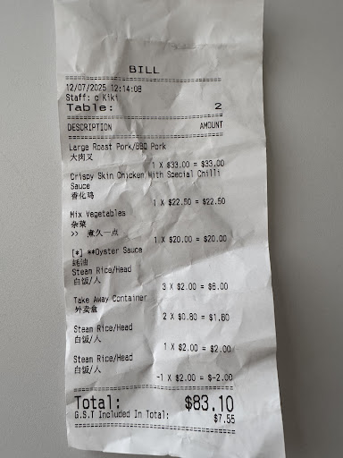 I arrived at lunch time with my wife, my father-in-law, and my 14 months old baby. We ordered our usual menu. That usual menu was whatâs shown on the bill photo - which included rice for 3. The order was repeated and confirmed by the pink waitress âRICE FOR THREEâ. The food came, true to our order, and we had an enjoyable family meal. We couldnât finish devouring the food so asked for take-away containers and I went to pay at the counter while my father-in-law was packing the food away.