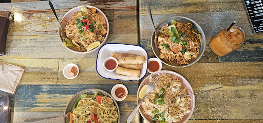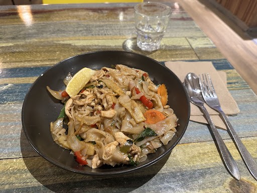 Thai curries and stir-fries served in a dining room with timber floorboards and a mural.