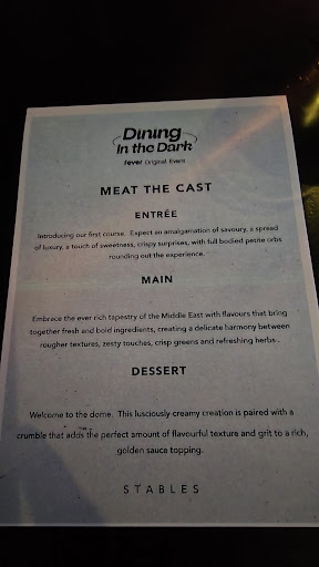 The event was well organised. We were laughing and really enjoyed it. Another minor feedback was about the noise from downstairs. Obviously it is a pub, there was a live music. However, the Dining in the Dark is meant to be more romantic and ambience to be more relaxing. It was a little bit hard to focus on your senses to really enjoy the food while blindfolded because the noise from downstairs was too loud.