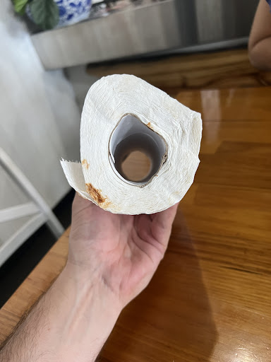 Photo 1: The questionable paper towel roll on our table. Not sure if I was meant to wipe my face with this hot mess, or if I was expected to wipe the table down prior to leaving. I’m genuinely unsure what the purpose of the dirty paper towel roll was for, if possible please let me know in a reply.