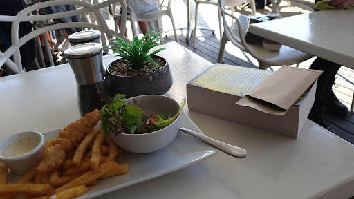 Late lunch. I had the barramundi which they swapped to chips & garden salad instead of the sides stated on the menu. My wife ordered the Seasalt salad with grilled chicken, & asked for the salad dressing on the side. Our requests were accepted with a smile & a cheery "no problem." We ordered a mojito for my wife & I had a can of Coke as I was the driver on the day. Total cost was $73.50. We sat at a table out on the deck looking over the marina. We had our dog with us (Cavalier King Charles Spaniel) & the wait staff brought a fresh bowl of cold water for him without us having to ask. Very much appreciated! The mojito arrived shortly after, & our meals about 15-20 minutes after we ordered. The barramundi was a fillet of reasonable size & nicely cooked, juicy & flaking nicely. I did find one small bone, but I don't have a problem with that as I'm always cautious with seafood. The chips were cooked just so, crunchy on the outside & fluffy inside. The salad was mostly lettuce (although of several varieties), with some grated carrot, 1 quarter of a tomato (I think it was the standard "gourmet" variety commonly available at most supermarkets & grocery stores), & 2 slices of cucumber cut diagonally from the cucumber. There was a small dollop of aioli on the side of the plate & a slice of lemon for squeezing over the fish. The Seasalt salad was quite large (again a lot of lettuce of different types), served in a bowl with the sweet potato cut into cubes, as was the feta. The chicken was also cut into cubes. The dressing was served in a small tub on the side of the plate. The chicken was cooked nicely, not dried out. My wife quite enjoyed the salad & said she would happily order it again. Overall, we had a very pleasant experience & can highly recommend...