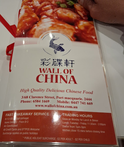 I have never been one to complain about poor service or bad food but quite frankly this is not just a matter of opinion, this is a public safety announcement. Last night was my first and most definitely my last time dining at this establishment. The service was not too bad at the beginning (but that soon changed) and the food came within 20 minutes, which is acceptable. The food arrived and my dish was subpar at best and had minimal flavour and was a horrid consistency. My friend ordered spring rolls, which i honestly could not even come close to trying to identify what the hell was in that and then she ordered honey chicken which was as dry as the waitresses enthusiasm. We were all a bit bar hum bug about our meals and not even close to satisfied, however considering the prices were completely outrageous we didn't feel like we could leave it, being university students. I was rummaging around in my meal trying to find something that resembled a vegetable and what did i find... CHICKEN! In a vegetarian chow mein, i mean come on people. I told the waitress about this and she merely said oh thats a shame isn't it. I mean, the audacity! She made no effort to address the situation or to ensure my experience was turned around and made positive by either offering to pay for the meal or at the very least replace the meal or offer something else from the menu on the house. What happened to the customer is always right ?! Especially when there is fat proof (in the form of a large piece of chicken) in front of you. To make matters worse, i have been unable to leave the bathroom majority of the morning (no need to explain further but you get the drift). I have never encountered anything like it, I urge you all to save your money and your stomach lining from the horrific experience of dining at Wall of China. Is for...