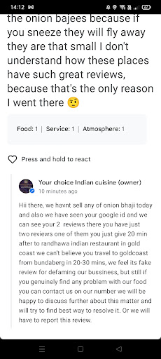 We were in Bundaberg for the weekend and seen this place had some decent reviews so we thought we'd give it a go. We were seated at a table for 2 and handed menus. We asked for the drinks menu and the waitress advised us that "there's no alcohol being sold at the moment as we don't make any money out of it because of Covid.." I asked my husband if he wanted to leave but we agreed that we would just eat our meal and go. I ordered poppadoms and an Indian salad, my husband onion bhajis. The salad didn't arrive at the same time and we were told this was because "it was coming from the kitchen" which explained why the poppadoms and onion bhajis were lukewarm and rubbery as they had obviously come from the bain marie at the front of the restaurant where takeaways were being dished up from. My Chicken Madras was brought to our table by a very grumpy looking gentleman and was inedible due to a strong chemical taste, but to be fair it was nothing I could put my finger on so decided not to complain about that. My husband's Chicken Tikka Masala was as red as tomato ketchup and tasted like it. No one asked why I had left my meal and the waitress left us standing at the till waiting to pay for 15 minutes while she attended to other matters (including clearing our table). Hands down, definitely the worst Indian meal we have ever had bar none. I feel the good people of Bundaberg need some serious competition if the good reviews for this place are...