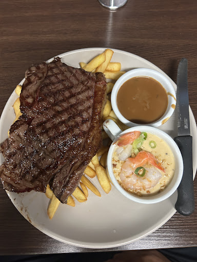 I had ordered a rump steak, side of mushroom sauce and creamy garlic prawns topper. Amazing meal perfectly cooked to my liking of medium rare. Chips were crispy; mushroom sauce was properly seasoned and the creamy garlic prawns sauce was also a good dipping sauce for the chips. ( rump 34$, 6$ for the creamy garlic prawn topper) Also my lovely sibling had ordered herself a Thai beef massaman curry with a coconut rice bowl on the side. Amazingly the beef was so tender came with some potatoes and had been perfectly seasoned. ( 22 $ , 5$ for the coconut rice bowl) I would recommend this place for sure for dates, family gatherings or a quick dinner spot too. Theyâve got a 15$ lunch menu with amazing dishes ; I did go for a quick dinner tho but I can assure you it was a...