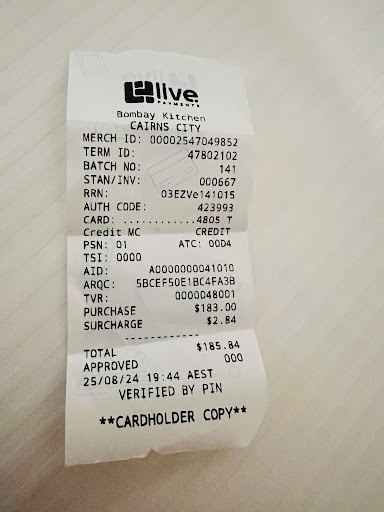 Very polite table service, bonless butter chicken tasted good but meat had several pieces of grissel attatched, steamed rice was not as nice as a rice i would make at home signifying they most likely use a far cheaper than a supermarket quality brand. On closer inspection of the rice it had an appearance not of a bright white colour but was greyish and some small black marks on some of the grains. Nann bread tasted as it was made from a much higher quality flour than i expected. So i was happy for a while. I was all ready to give these guys a decent review as i could hear the waitress telling a large table of consumers about why they should leave a good review untill i went to the counter and could see how filthy dirty the counter top and toilet doors right next to the kitchen were. I'm a car mechanic and we keep our bench tops work areas customer vehicles, customer waiting areas and touch areas a lot cleaner than what i was shocked to see in front of me after the quick meal I'd just eaten. This is appalling for a food restraunt, the no wipe no worries method of food safety was in bold and underlined policy here, i scoured at the a4 framed certificates on the wall from cairns council and food safe certification as i knew its only an 80 dollar online course. No overexaduration, literally thousands of greasy and grimey fingerprints all over the surfaces of the phone walls and every part of the counter that looked to be much browner the closer they get to around the dunny doors. I can't eat there again and nor should anyone who wants to eat from shops where at least one of the workers knows what the word hygene is. I had a strong feeling of Dheli belly hurting on the sight of the state of there point of service and the thoughts of what monsters live behind the grubby spring loaded barn door in the food prep area where from my meal had been scouped...