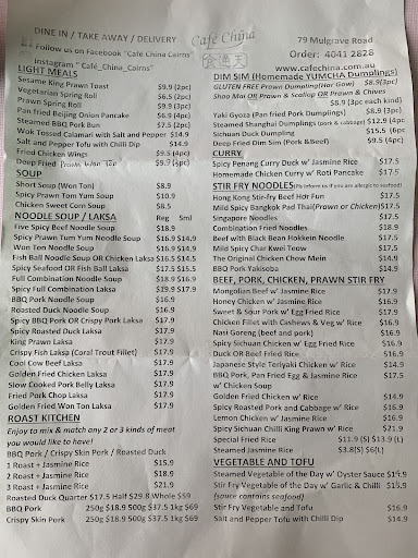 Read moreCame here today for lunch as I was craving Cafe China's Spicy Duck Laksa. I come here often and only here for my Laksa. I used to go to Cafe China when they were at the Casino and The Pier, many years ago for their Peking Duck salad. Since they no longer make it, I tried the Duck Laksa instead. Best Laksa in Cairns hands down! It's soooo good I had to finally make a review. It has a great combo of noodles, delicious broth and a generous amount of lovely duck. I don't know what they put in the broth but I could have it just on it's own! It's so aromatic, warming and literally makes me dance in my seat. Even my older children love it and beg me to take them there all the time. Service is quick and very friendly. Thank you...