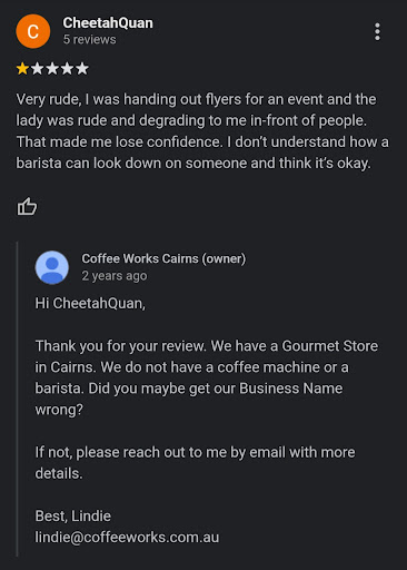 Read moreI have been buying coffee from Coffee Works for quite a few years and it’s wonderful, amazing quality. I live in Brisbane and (try to) buy the beans when I’m in Cairns as it’s quite expensive for delivery. The last 3 times I’ve travelled to Cairns I’ve been unable to buy the beans in person, yet can leave the store and buy them immediately online. If you are going to have a specialty coffee store at least stock the store with coffee. It’s really disappointing to not be able to buy what you want especially knowing that you have that coffee, just...